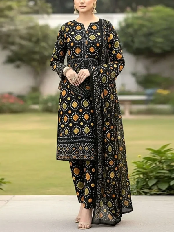 Khawaja Collection Aneela’s Sindhi Print Black 3 Piece Unstitched Lawn Suit – Summer Collection